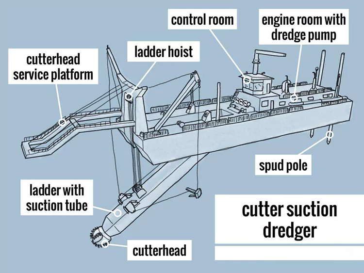 सक्शन आणि डिस्चार्ज सिस्टम: स्लरी सक्शन हेड, ऑन-बोर्ड सक्शन पाईप, मड पंप आणि डिस्चार्ज पाईपद्वारे नियुक्त केलेल्या खराब क्षेत्रामध्ये वाहून नेली जाते.